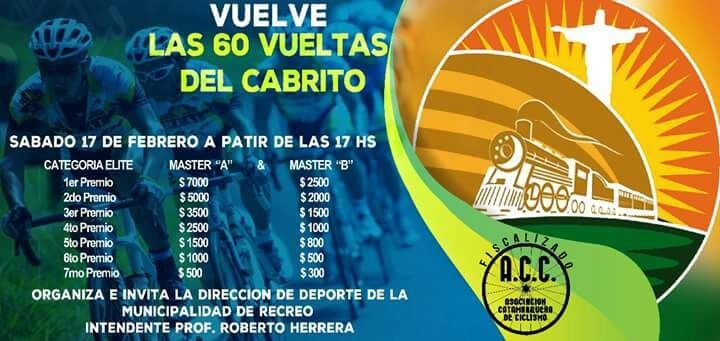 Recreo (C) - Tras 15 años de ausencia, el próximo 17 de febrero a partir de las 17 horas regresa la prueba ciclistica "60 Vueltas del Cabrito, en el circuito callejero de nuestra Ciudad.