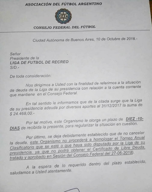Además dejan debidamente esclarecido, que de no cancelar la deuda “este Organismo no procederá a Homologar el Torneo Anual Clasificatorio que esté o que haya sido disputado por la Liga que Usted Preside".