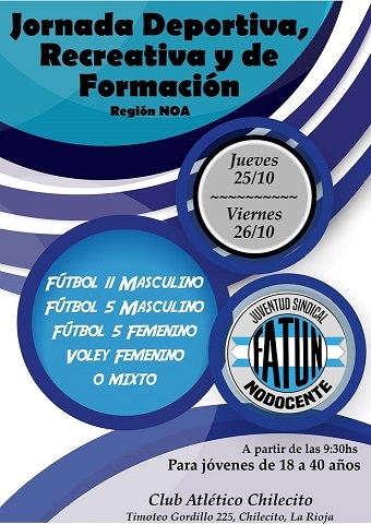 El gremio APUNCa, convoca a afiliados y adherentes que deseen participar del Encuentro Regional Deportivo y de Formación, que se llevará a cabo en Chilecito, los dias 25 y 26 de octubre, a una reunión para el próximo martes 9, a las 10 en el salón de Sede Central de Av. Belgrano 414.