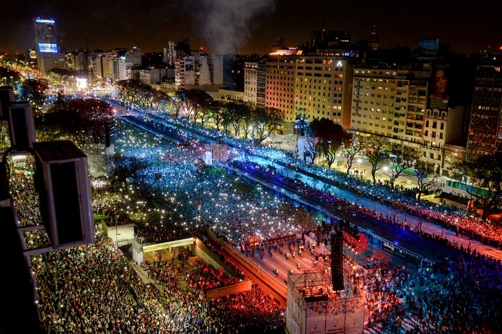 Un grupo de boys scouts va caminando y cantando por la Avenida de Mayo hacia 9 de Julio. Cerca de ese ingreso la espera es con mate o cerveza, helado o garrapiñada, parados, o sentados sobre bancos; maceteros o los cordones de la vereda, que se vuelven espacios codiciados. Algunos se asoman por los balcones de los edificios ubicados sobre Cerrito o Lima.