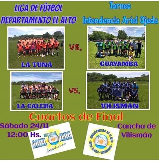 viernes, 23 de noviembre de 2018 12:29 viernes, 23 de noviembre de 2018 12:29 Los partidos a disputarse serán: La Tuna vs. Guayamba y La Calera vs. Vilismán. En la cancha de la localidad de Vilismán, el horario de comienzo del encuentro es a partir de las 12.