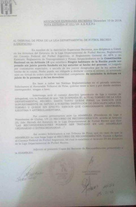 En caso de no obtener una respuesta favorable e inmediata por parte de la Liga y sus organismos, la Institución Esperanza Recreina elevara su descargo al Consejo Federal (A.F.A) y agotara todos los recursos legales que marcan el Estatuto de la Liga Departamental y la Constitución Nacional a fin de terminar y esclarecer el atropello que sufrió la institución.