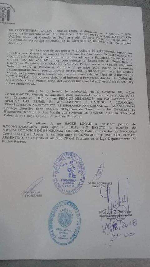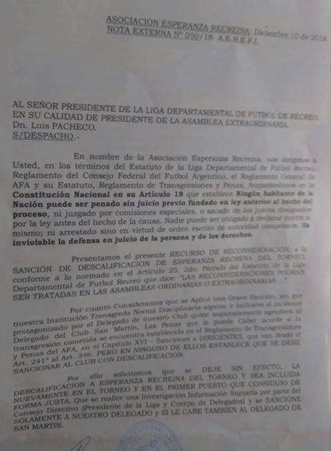 Cabe aclarar por lo que se informó en un Programa Radial Deportivo local que “Ni el articulo 242 ni el 252” al que hacen referencia, tuvieron en cuenta para descalificar a Esperanza Recreína. Argumentan tal descalificación por parte del Presidente de la Liga y solo un Delegado fue sancionado, el de Esperanza y no los dos como argumentan”.