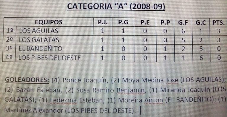 En la 1ra. fecha del certamen, por la Categoría “A”, Los Águilas vencieron 6-1 a Los Pibes del Oeste; en tanto que Los Galatas se impusieron 5-2 a El Bandeñito.