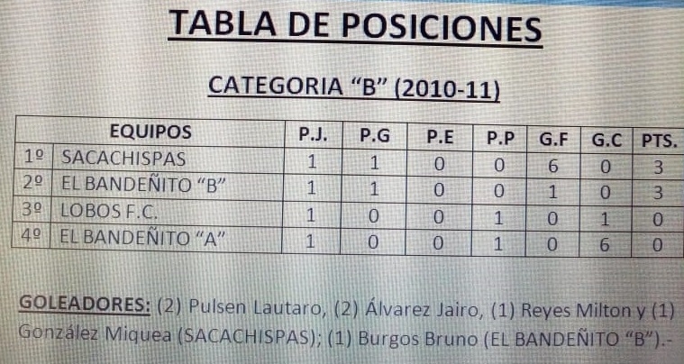 Y Por la Categoría “B”, Sacachispas superó 6-0 a El Bandeñito “A”, en tanto que El Bandeñito “B” le ganó 1-0 a Lobos FC.