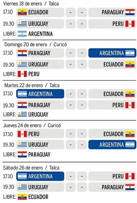 Después jugarán con Ecuador el martes 22/Ene.; el jueves 24/Ene. con Uruguay y el sábado 26/Ene. con Perú. La Fase Final, irá desde el 29 de enero al 10 de febrero en la ciudad de Rancagua.
