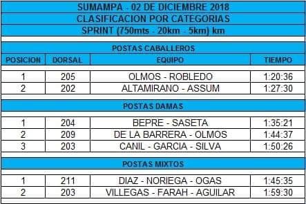 La prueba, por el toneo 2018/19 de la especialidad, que congregó a una gran cantidad de triatletas, se cumplió con el marco de una fría y desapacible jornada, atenuada por las bellezas del lugar y las permanentes atenciones de los organizadores, entre quienes se contaron las direcciones de Deportes y de Turismo de Paclín, a cargo Fabio Agüero y Pablo Savio, respectivamente.