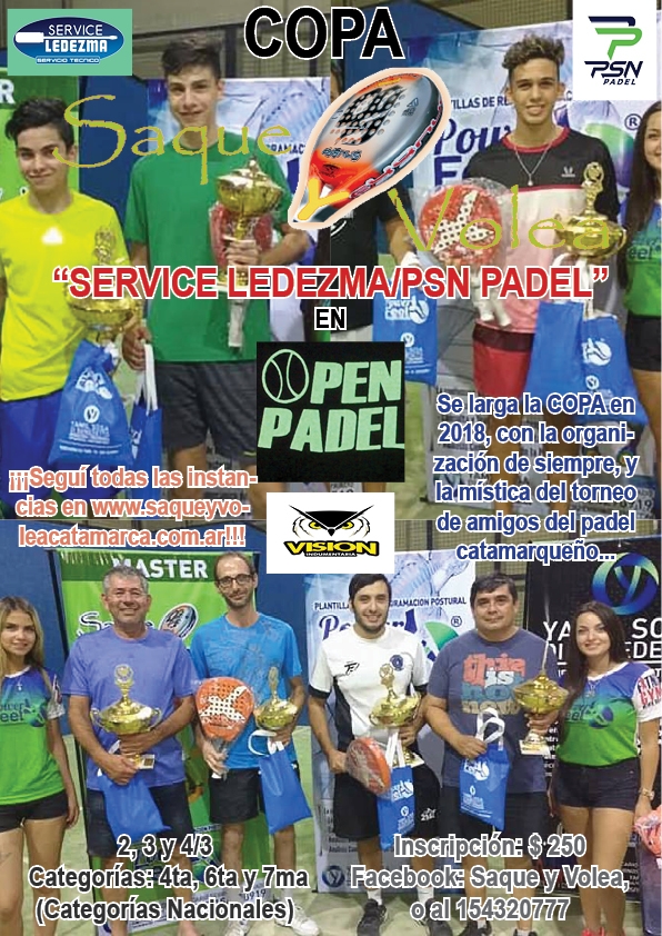 Con gran expectativa da inicio la temporada 2018, de la Copa Saque y Volea “Service Ledezma/PSN Padel”, a partir de este viernes y hasta el domingo, con tres categorías puntuables camino al Máster de fin de año. 4ta, 6ta y 7ma, categorías nacionales, serán las que se darán cita en Manuel Navarro 150, en el club Open Padel, en la Séptima temporada del Circuito, y cumpliendo con ésta la 46ta competencia en la historia.