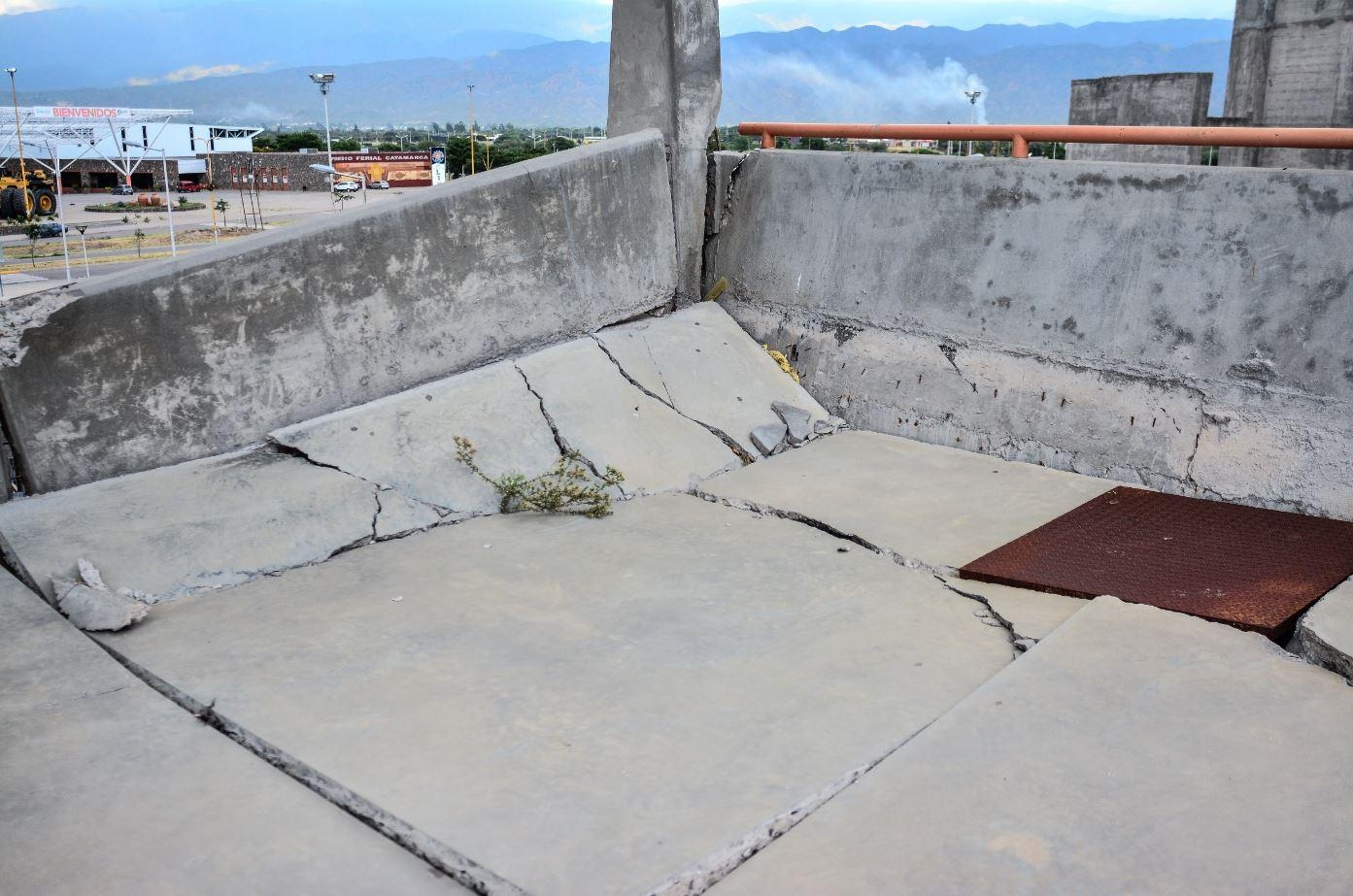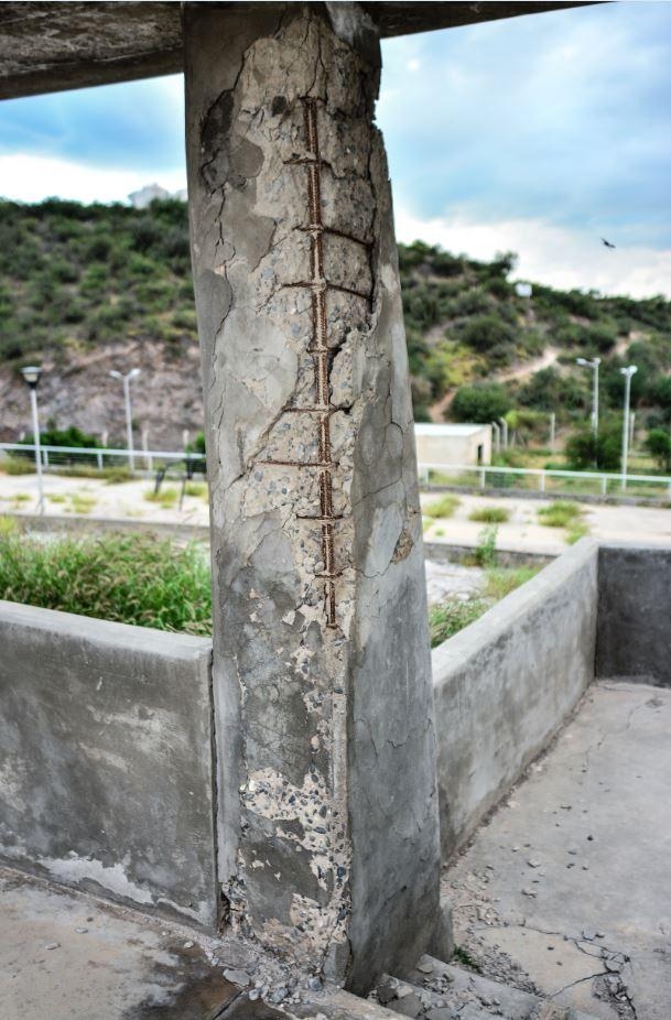 La lista de daños y falencias no termina allí. En la tribuna sur, además del colapso parcial de sus gradas, el muro perimetral de contención tiene un 10 por ciento de inclinación con respecto a la vertical. Las grietas y las fisuras están presentes en las escaleras de acceso principal y en el ingreso a los baños y se suma la presencia de sales en el Hormigón y sectores con pérdidas de recubrimiento.