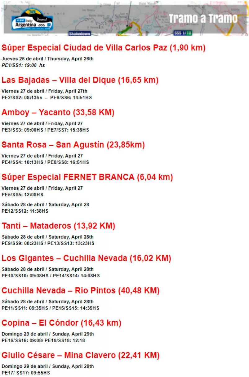 En total, los pilotos recorrerán 358,20 kilómetros cronometrados. Entre los tradicionales tramos, habrá dos nuevos: el mencionado Súper Especial Nocturno (SSS1) y Tanti-Mataderos (SS9 y SS13).