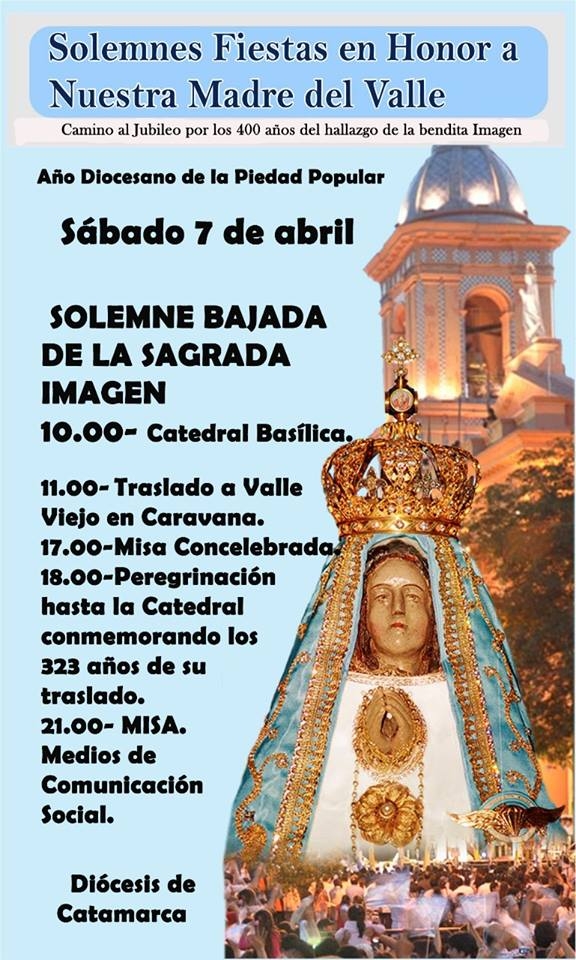 Las actividades marianas el sábado, seguirán en Valle Viejo a las 17hs con una Misa Concelebrada y a las 18hs será la Peregrinación desde Valle Viejo hasta la Catedral conmemorando 323 años de su traslado. (Recorrido: Camino de la Virgen, Av. Pte. Castillo, Venezuela (Belgrano), Alem, República y Sarmiento hasta Catedral).