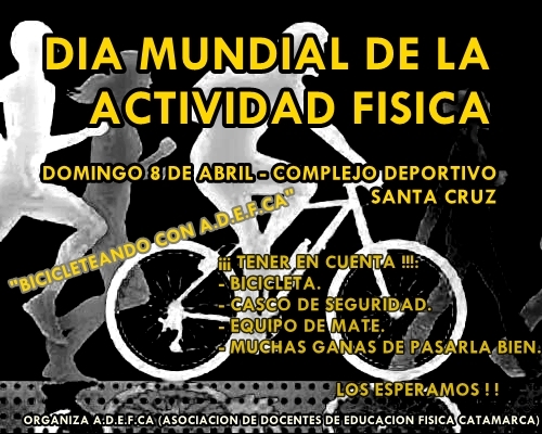 Y en el plano de sus actividades deportivas y de interacción con la comunidad, para este domingo 08 de abril, a partir de las 15 hs., la entidad de los “PF” promueve una jornada a pleno movimiento, denominada “Bicleteando con Adefca”, que tendrá epicentro en el Complejo Deportivo que los “profes” poseen en la localidad de Santa Cruz, deparamento valle Viejo.