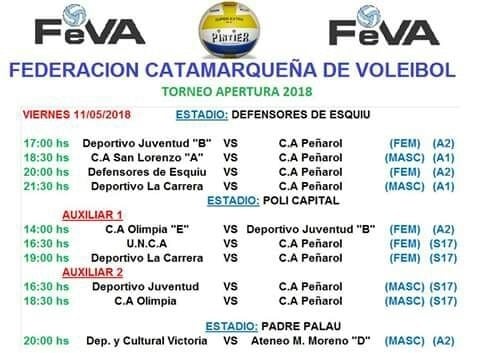 Este viernes en Defensores de Esquiú y las canchas auxiliares del Polideportivo Capital “Fray Mamerto Esquiú” se disputará una nueva fecha del torneo Apertura 2018 de la Federación Catamarqueña de Vóleibol.