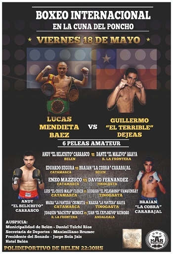 De combate central, a nivel profesional, Lucas “Mendieta” Báez (32-16-5 con 16 KO) enfrentará al chileno Guillermo “El Terrible” Dejeas (8-16-2 con 2 Ko), en la categoría Supergallo y a ocho asaltos de extensión.