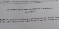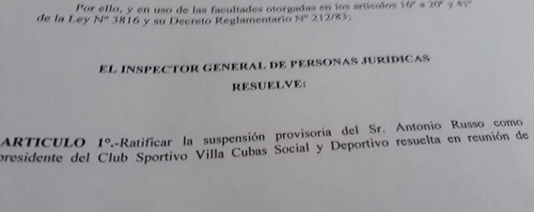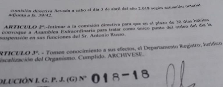 De todos modos, el organismo provincial intimó a la CD villacubana, para que “en el plazo de 30 días hábiles convoque a Asamblea Extraordinaria, para tratar como único punto del orden del día la suspensión en sus funciones del Sr. Antonio Russo”.