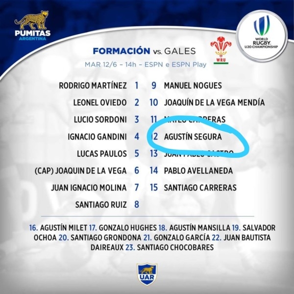 De acuerdo a la información oficial de UAR (Unión Argentina de Rugby), el catamarqueño Segura se calzará la casaca número 12 del equipo argentino.