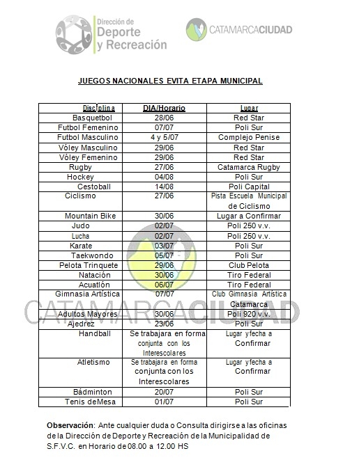 La fase competitiva del certamen dará inicio el día 23 de junio en las instalaciones del polideportivo sur, Ramón Quiebra Castillo con las partidas de Ajedrez y culminarán el 14 de agosto con los enfrentamientos de cestoball en el Polideportivo Fray Mamerto Esquiú.