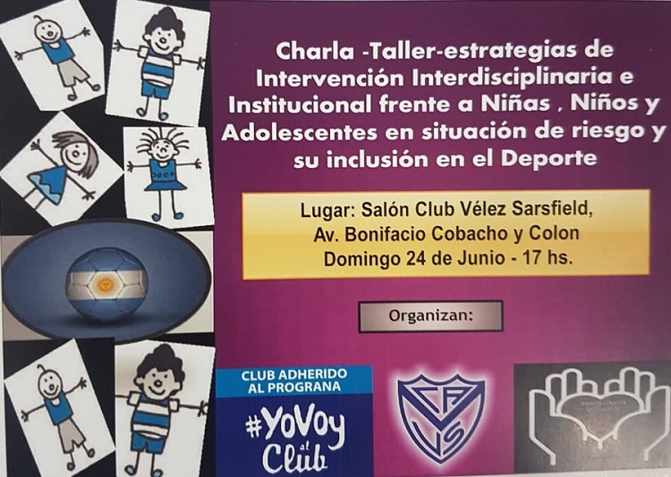 Y el domingo 24 de Junio, a las 17 hs., en el Salón del Predio Deportivo del Club Velez Sarsfield tendrá lugar un Taller Informativo dirigido a niñas, niños y adolescentes sobre Situaciones de Riesgo y la Importancia de la Inclusión Deportiva. Esta charla est abierta también a las madres, padres y vecinos en general.