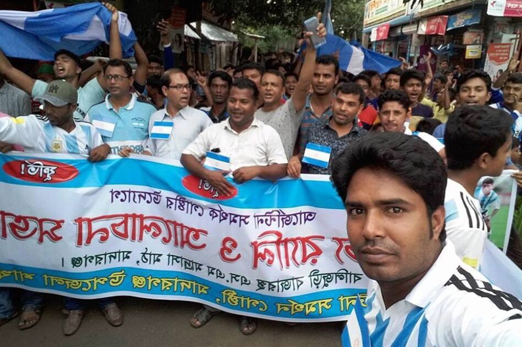 Los videos que muestran ese entusiasmo se hicieron virales. Cientos de bangladesíes en caravana -en moto, a pie, a bordo de camionetas- con camisetas de la Selección, banderas argentinas y la cara pintada de celeste y blanco. Multitudes de hombres y mujeres mirando el partido frente a pantallas gigantes gritando "¡Me-ssi, Me-ssi!" como si se tratara de la Plaza San Martín. Hinchas con la voz ronca después de gritar durante todo el partido, intentando explicar a los periodistas locales por qué la Pulga es el mejor jugador del mundo.