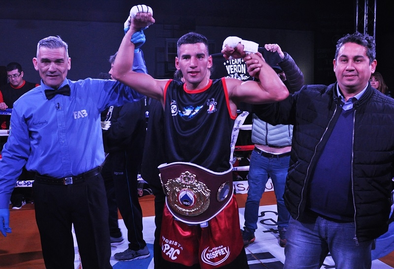 Estrenando su reinado en casa, Verón, ex integrante del seleccionado argentino amateur, actual Nº 7 del ranking mundial welter OMB y Nº 3 del escalafón nacional welter, tras un comienzo de estudio manejó siempre las acciones para terminar sometiendo duramente a Aquino, Nº 7 del ranking argentino welter, doble retador a esta misma corona, que tras dos caídas a la lona perdió sin atenuantes. Luego de tomarse sus tiempos en los primeros capítulos, a partir del cuarto el campeón aceleró y comenzó a filtrar sus cruzados y ascendentes al rostro. Pero en el quinto mostró su inteligencia para encontrar los huecos dejados por la defensa rival y añadió sus punzantes ganchos diestros a las costillas, para castigarlo duramente y provocarle dos caídas y así definir las acciones.