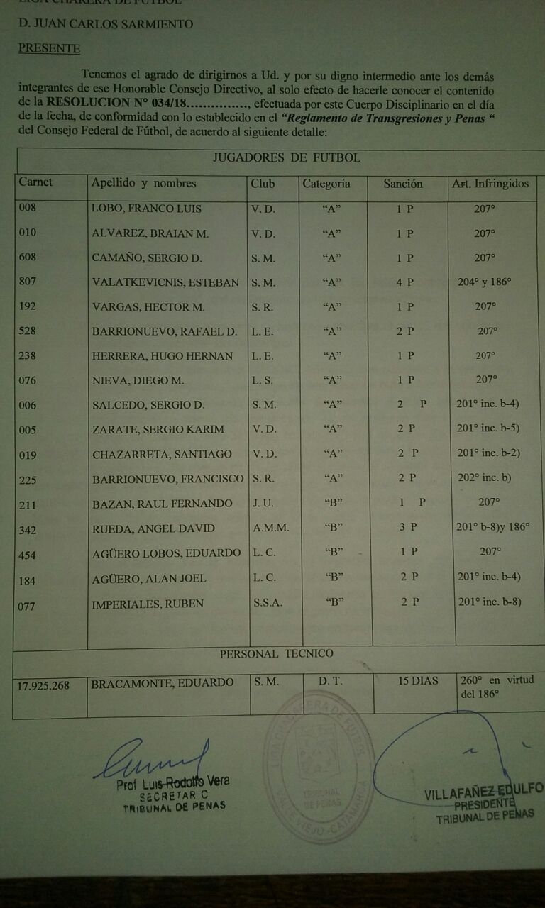El informe tribunalicio lleva las firmas del Prof. Luis Rodolfo Vera, secretario, y Edulfo Villafañez, presidente del Tribunal de Penas de la Liga Chacarera.