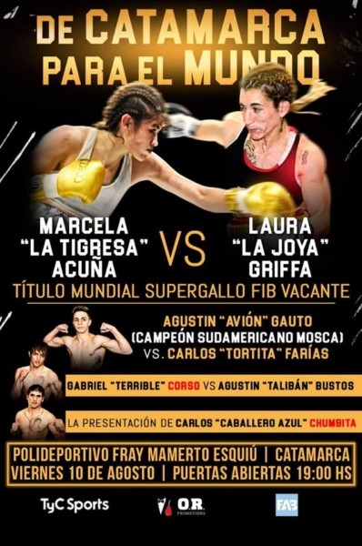 Categoría Supergallo, 10 rounds. Por. Título Mundial FIB: Marcela “Tigresa” Acuña (Formosa) vs. Laura “La Joya” Griffa (Bs. As.).