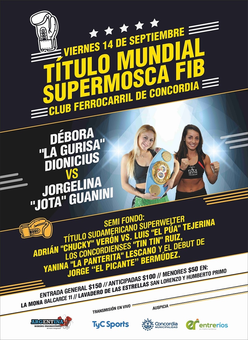 En el combate estelar de la velada, la campeona mundial supermosca de la Federación Internacional de Boxeo (FIB), la invicta entrerriana Débora “La Gurisa” Dionicius (28-0, 6 KOs), se enfrentará a la monarca sudamericana gallo, la bonaerense Jorgelina “Jota” Guanini (8-1-1, 1 KO), intentando defender por decimotercera ocasión su corona.