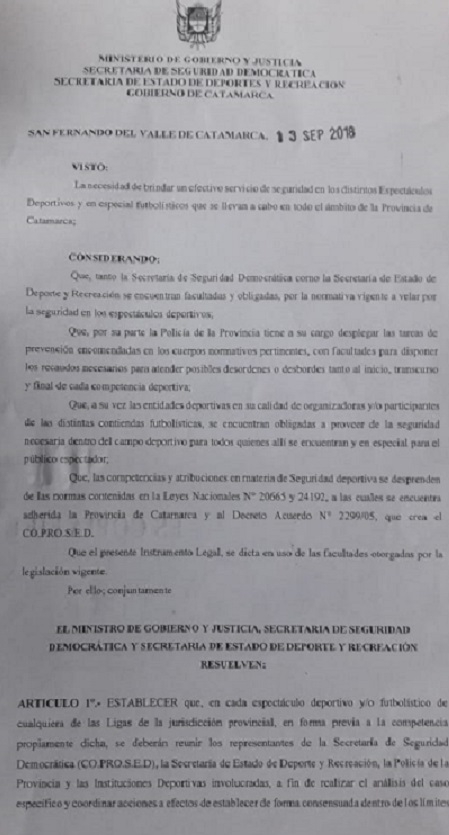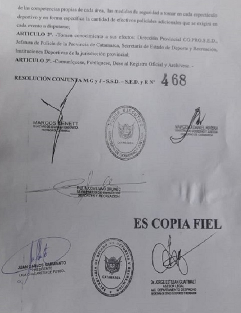 Por el Art. 2do., se dispuso comunicar lo acordado a la “Dirección Provincial Co.Pro.Se.D, Jefatura de Policía de la Provincia de Catamarca, Secretaría de Estado de Deportes y Recreación, Instituciones Deportivas de la Jurisdicción Provincial”.