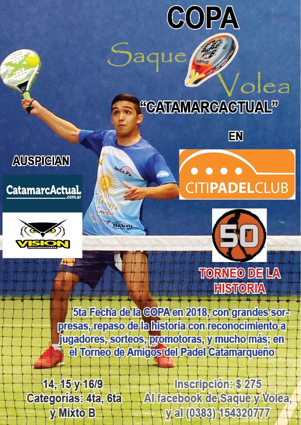 Con un increíble fin de semana por adelante, y cumpliendo 50 torneos, la COPA SAQUE Y VOLEA sigue su curso en este 2018. 4ta, 6ta y Mixto B, estarán presentes en la Copa “CatamarcActual”, a jugarse en Citi Padel, en Avenidad Recalde y Valentín Berrondo de nuestra ciudad.