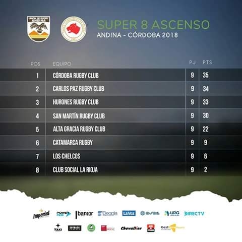 Posiciones “Súper 8” Regional de Ascenso: 1°) Córdoba RC 35 Pts., 2°) Carlos Paz RC 34; Hurones RC 33; San Martín de Va. María 30; Alta Gracia RC 22; Catamarca RC 9; Los Chelcos 8 y Club Social de La Rioja 2.