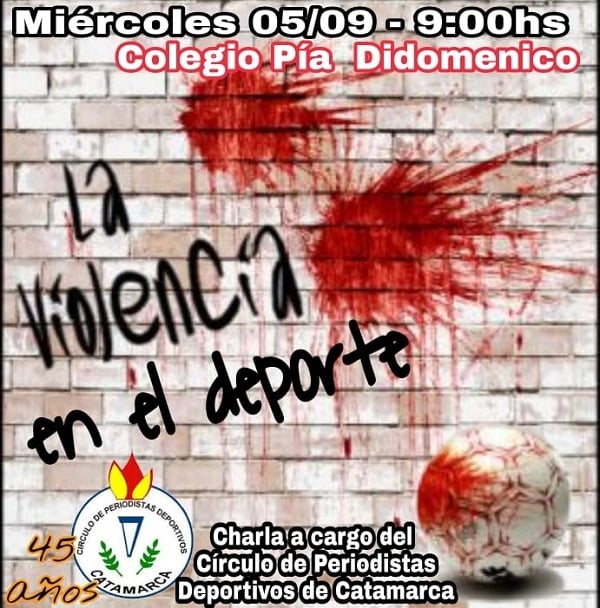 Con la intención de abordar la problemática desde distintos ámbitos, socios del Círculo de Periodistas Deportivos de Catamarca (CPDC) disertarán este miércoles ante los alumnos del Nivel Secundario del Colegio Pía Didomenico con el objetivo de mostrar, analizar y debatir sobre los disparadores que provocan la violencia no solo en el deporte sino en distintos ámbitos.