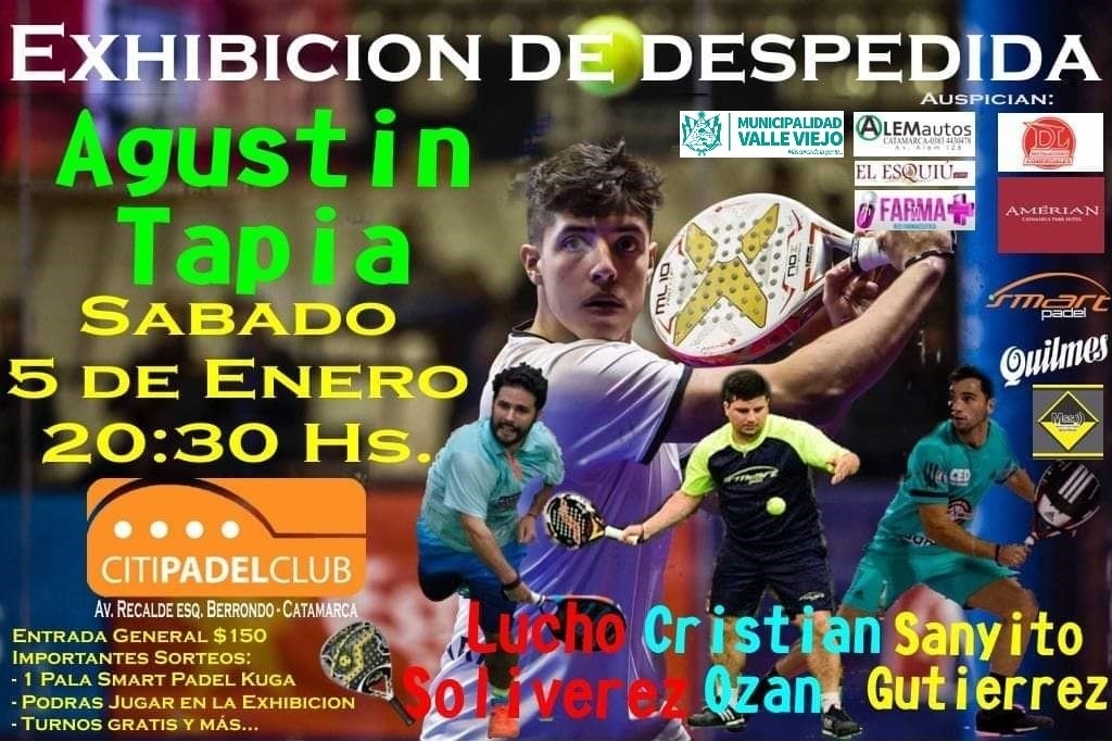 Será hoy, como cierre de su gira en nuestra provincia, la presencia del catamarqueño más importante de la historia de nuestro Padel: Agustín Tapia (58° del Ranking World Padel Tour), quien compartirá cancha con el bonaerense de Vicente López: Luciano Soliverez (5° del país), con el que llegara a escalar en la temporada 2017, al puesto número 1 del Ranking AJPP. Además, sus rivales serán Cristian “Sanyito” Gutiérrez, (69° del WPT), y el puntano Cristian Ozán (hoy número 3 de Argentina).