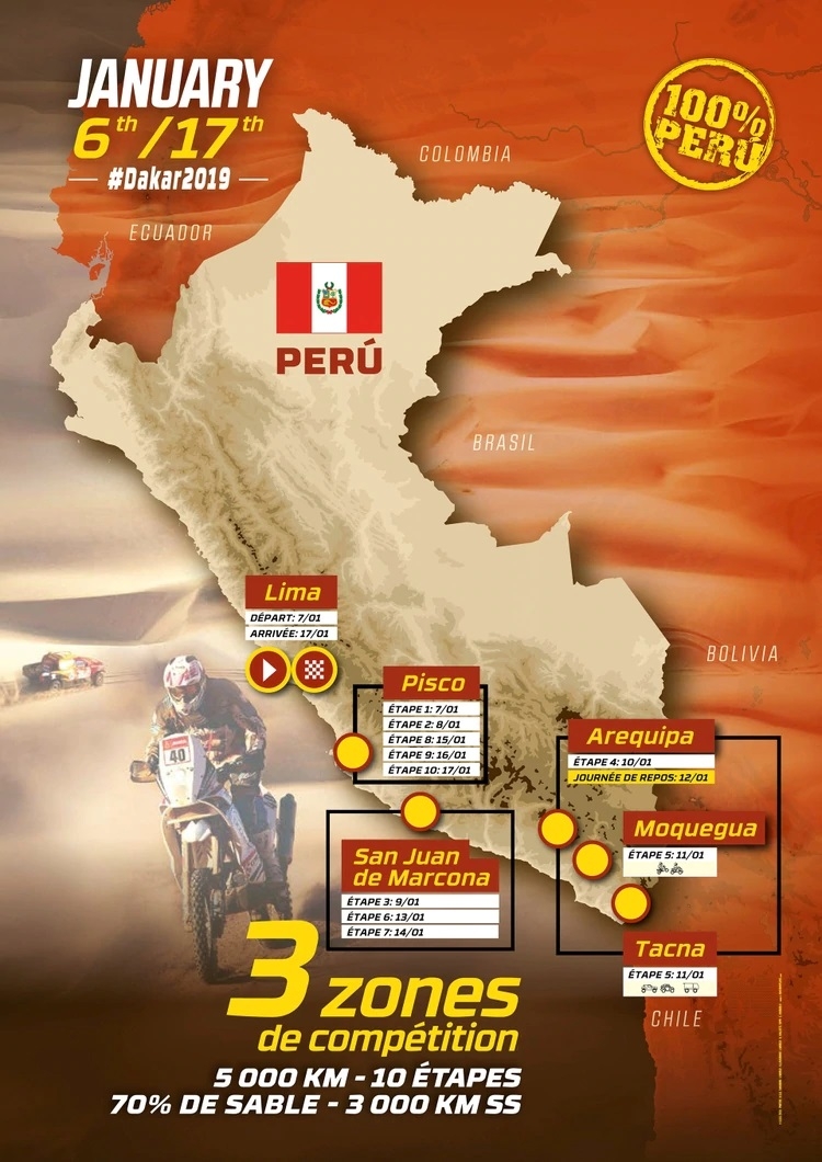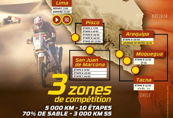 El Dakar 100 % peruano, que tendrá como punto de partida y de llegada la capital de Lima, se ceñirá únicamente al sur del país para visitar las ciudades de Pisco, San Juan de Marcona, Arequipa, Moquegua y Tacna.
