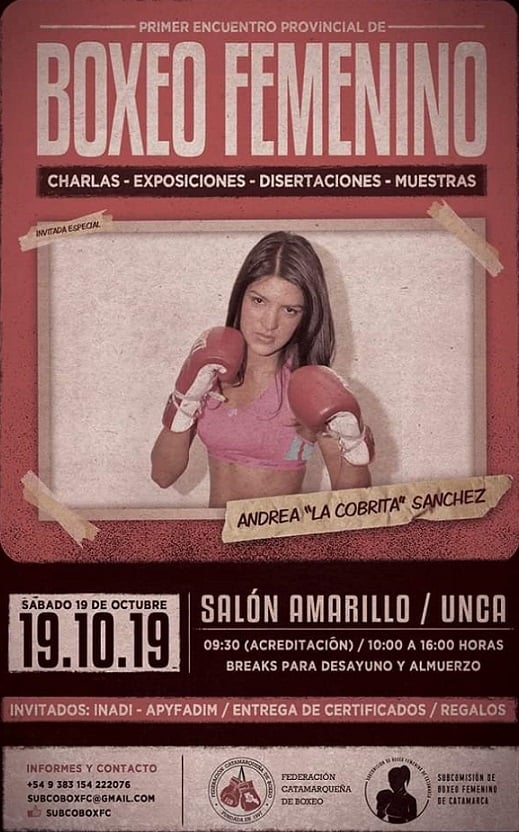 El mismo tendrá lugar en el salón “Amarillo” de la UNCA, a partir de las 9, y prevé la presencia de ex retadora al título mundial Minimosca FIB, Andrea “La Cobrita” Sánchez, como invitada especial.