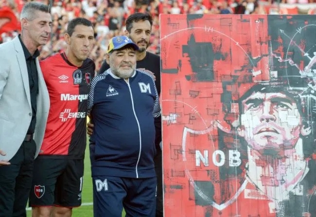 Un cuadro con la imagen del Diez en sus días en la Lepra, otra gigantografía con una ilustración de su figura con los colores rojinegros y la cinta de capitán otorgada por Maxi Rodríguez fueron los obsequios que emocionaron al DT del Lobo, quien devolvió el amor recibido con el sello de su firma en el trono que le preparó el club para que pueda observar el encuentro.