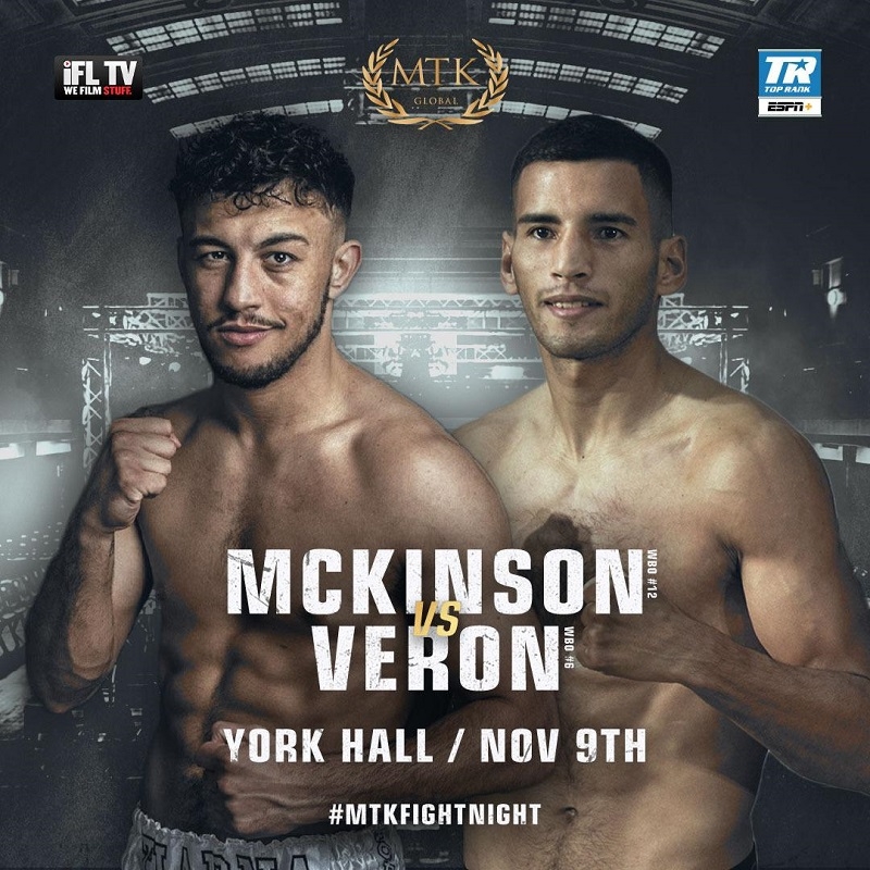 En un duelo entre dos altos clasificados que dejará al ganador a las puertas de un título mundial, Verón (17-0-2, 8 KOs), actual Nº 6 del ranking mundial welter OMB, que realizó cuatro defensas exitosas del título latino OMB y que llega del pasado 7 de junio igualar frente al bonaerense Maximiliano Verón en Cutral Có, Neuquén, tendrá su gran prueba. Enfrente estará McKinson (17-0, 2 KOs), Nº 12 del mismo escalafón, ex campeón juvenil welter CMB e internacional plata welter CMB, y que viene del 20 de julio último conquistar su cetro europeo OMB al doblegar al ruso Evgeny Pavko en decisión unánime en Brentwood, Inglaterra.