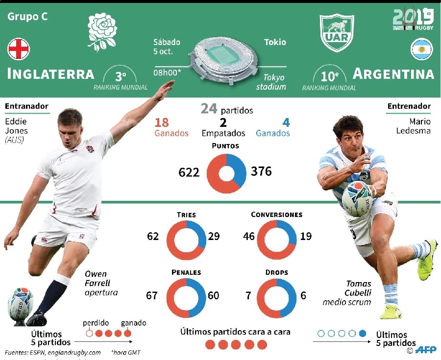 El crucial encuentro del Grupo C se jugará desde las 5 de la mañana de nuestro país en el Tokyo Stadium, con arbitraje del galés Nigel Owens y televisación de la TV Pública, ESPN 2, ESPN 3 y también por ESPN Play. Además del triunfo, sería ideal si el equipo nacional consigue el punto bonus ofensivo por marcar cuatro o más tries, para subir más en la tabla de posiciones.
