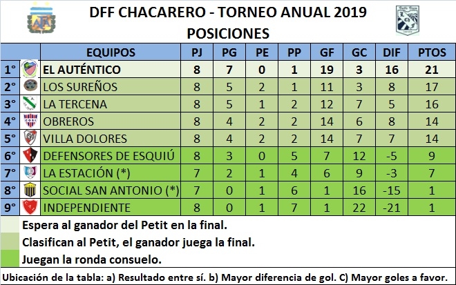 Posiciones Finales: 1°) El Auténtico 21 Pts., 2°) Los Sureños 17, 3°) La Tercena 16, 4°) Obreros 14, 5°) Villa Dolores 14, 6°) Defensores de Esquiú 9, 7°) La Estación 7, 8°) Social San Antonio 1 y 9°) Independiente 1.