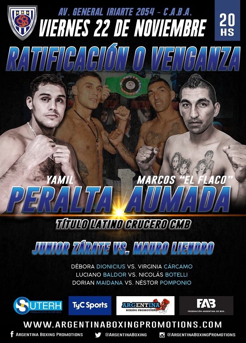 Ya se midieron. En un duelo caliente, la victoria fue para un lado. Ahora, en una noche llena de campeones, será tiempo de “Ratificación o Venganza”. El campeón latino crucero del Consejo Mundial de Boxeo (CMB), el doble olímpico e invicto bonaerense Yamil Peralta, se enfrentará al ex monarca latino puntano Marcos “El Flaco” Aumada, intentando defender por primera ocasión su corona, en una esperada revancha, en el combate estelar de la velada que se desarrollará este viernes, 22 de noviembre, en el Club Sportivo Barracas, sito en Av. General Iriarte 2054, ciudad de Buenos Aires, Argentina, en una nueva producción de Argentina Boxing Promotions, de Mario Margossian, que será transmitida en vivo a través de TyC Sports a partir de las 23, para Argentina y toda América.