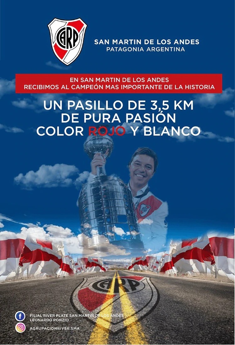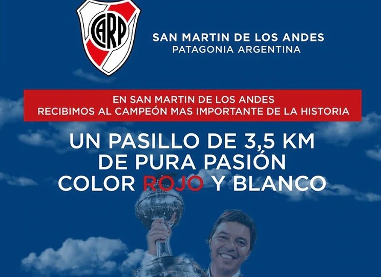 “Vení con tu familia a vivir un momento único recibiendo al campeón más importante de la historia. Un pasillo de pura pasión color rojo y blanco”. Así anuncia la filial River Plate de San Martín de Los Andes, que lleva el nombre de un referente como Leonardo Ponzio, el recibimiento que preparan junto a otras agrupaciones y peñas de la Patagonia para el plantel de la Banda, que realizará en la localidad la pretemporada de cada a los desafíos futbolísticos que propone el 2020.