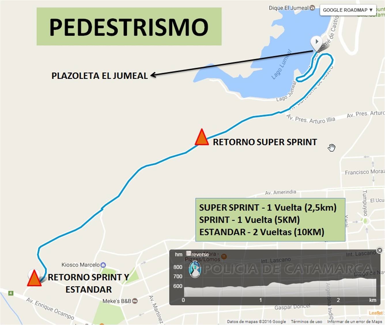 Las motocicletas pertenecientes a la Dirección de Seguridad Vial de la Policía de la Provincia realizaran el acompañamiento de los competidores en el tramo de la competencia de Ciclismo por el recorrido desde la Plazoleta Dique el Jumeal Av. Bartolomé de Castro, continuando por Av. México Oeste, Av. Virgen del Valle, hasta Av. Los Terebintos y regresando por la misma vía hasta el punto de partida" cuenta con una distancias 10KM: Short (una vuelta) y Sprint (dos vueltas).