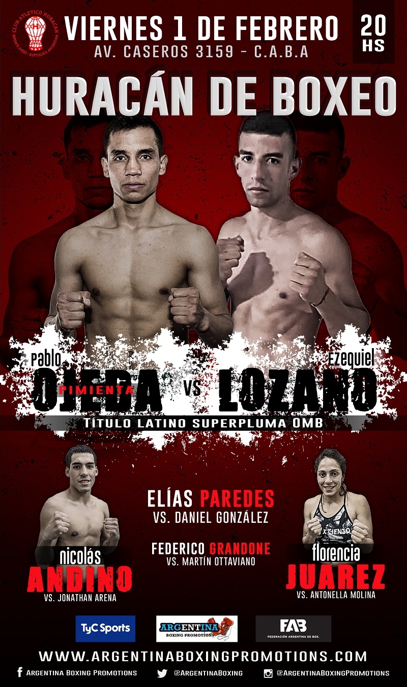 El ex campeón internacional superpluma pampeano Pablo “Pimienta” Ojeda se enfrentará al bonaerense Ezequiel Sayal Lozano, en disputa del título latino superpluma de la Organización Mundial de Boxeo (OMB), que se encuentra vacante, en el combate estelar de la velada que se desarrollará este viernes, 1 de febrero, en el Club Atlético Huracán, sito en Av. Caseros 3159, ciudad de Buenos Aires.