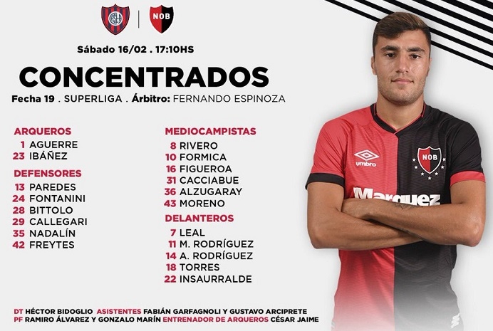 Pese a las dudas que se le presentaron a lo largo de la semana, Bidoglio tendría definido el once titular para el partido con el cuervo. Solamente haría un cambio respeto del equipo que empató con Central en el Coloso del Parque: Cristian Insaurralde entrará de arranque en lugar de Víctor Figueroa, de floja actuación en el clásico.