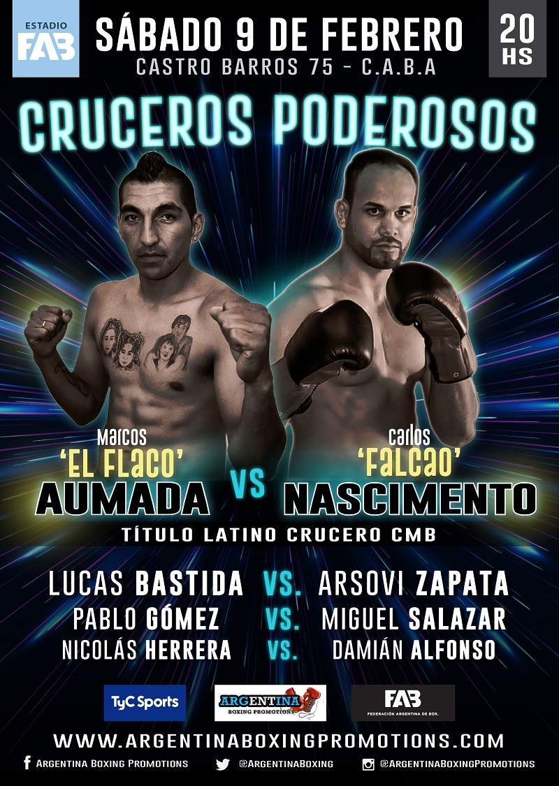 El campeón latino crucero del Consejo Mundial de Boxeo (CMB), el puntano Marcos “El Flaco” Aumada, se enfrentará al brasileño Carlos “Falcao” Nascimento, intentando defender por segunda ocasión su corona, en el combate estelar de la velada que se desarrollará este sábado, 9 de febrero, en el estadio de la Federación Argentina de Box (FAB), sito en Castro Barros 75, ciudad de Buenos Aires, Argentina.