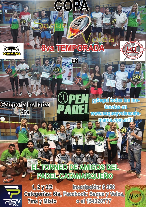 Con la historia como respaldo, la Copa Saque y Volea se pone en marcha en 2019, con la disputa de cuatro categorías en Open Padel. En 3ra, con invitación para ésta 1ra Fecha, habrá efectivo más indumentaria de Nuro Padel Catamarca en premios; en tanto que en el resto (6ta, 7ma y Mixto), los premios serán: equipo deportivo (remera y short), de Visión Indumentaria) para los campeones, y remera de PSN para los sub.