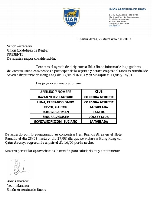 La comunicación hecha a la Unión Cordobesa de Rugby, por la actual pertenencia de Segura al Jockey Club de aquella provincia, precisa que “de acuerdo a lo programado, la concentración inicial (previa al viaje) se hará en el Hotel Ramada de Buenos Aires, desde el día 25 al 27 de marzo, día en que se iniciará el viaje por la aerolíneas Qatar Airways, regresando al país el día 16 de abril por la noche”.