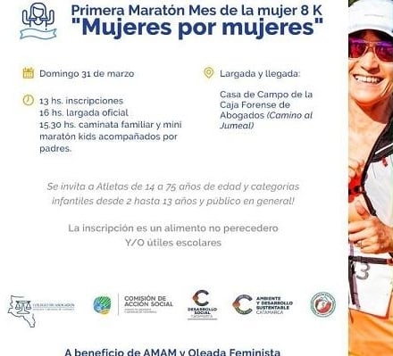 La carrera de 8 de Kms., que está incluida entre las actividades por el Mes de la Mujer y en beneficio de la AMAM y Oleada Feminista, es organizada por Comisión de Acción Social de Desarrollo Social y Colegio de Abogados, y cuenta con el auspicio de la Secretaría de Ambiente y Desarrollo Sustentable.