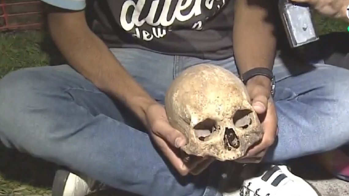Gabriel Aranda, uno de los tantos hinchas de Racing que fue al Obelisco a celebrar el flamante título en la Superliga, se llevó todas las miradas por su particular "acompañante": el cráneo de su abuelo fallecido.