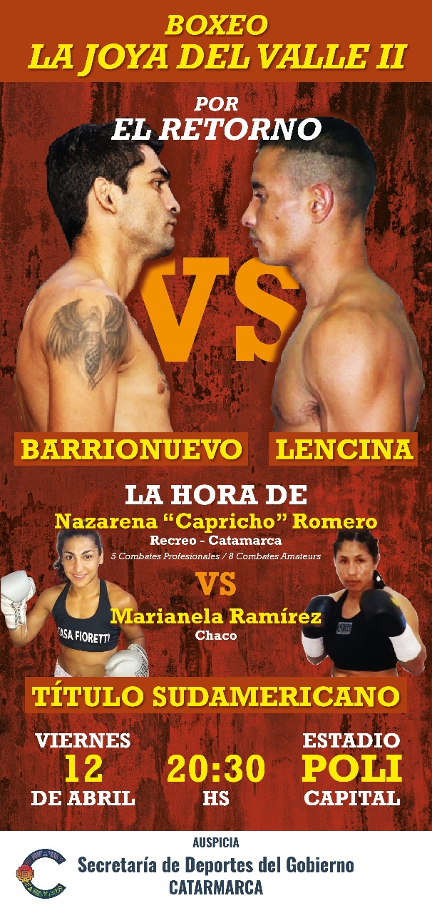Tras su gran nocaut ante Adrián "Chucky" Verón y su debut en Nueva York, Estados Unidos, "La Joya" (34-4-2-24 ko) volverá a Catamarca para combatir ante Juan Eleuterio Lencina (22-3-3-5 ko), dentro de la categoría Súper Welter a 10 rounds.