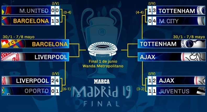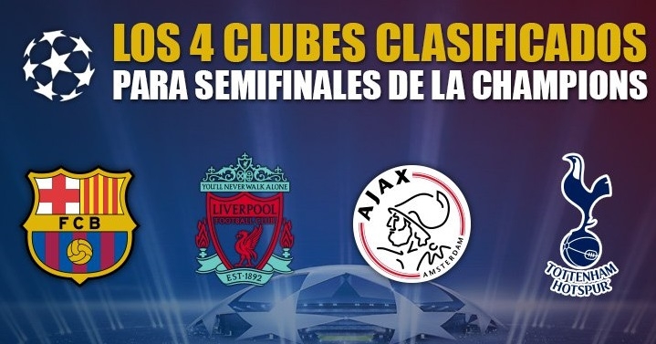 FC Barcelona de España, Liverpool y Tottenham de Inglaterra y Ajax de Holanda lograron esta semana sus billetes para las semifinales de la Champions League 2018-19, y afrontarán sus eliminatorias correspondientes con la ilusión de estar el próximo 1 de junio en el Wanda Metropolitano.